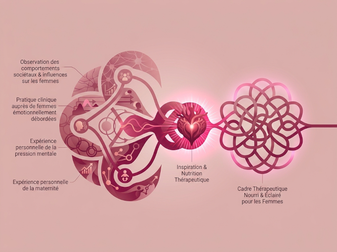 L'observation des comportements sociétaux et leurs influences sur les femmes en particulier, ma pratique clinique auprès de femmes souvent en naufrage émotionnel, l'expérience personnelle de la pression mentale et de la maternité : voici ce qui m'inspire et me nourrit.